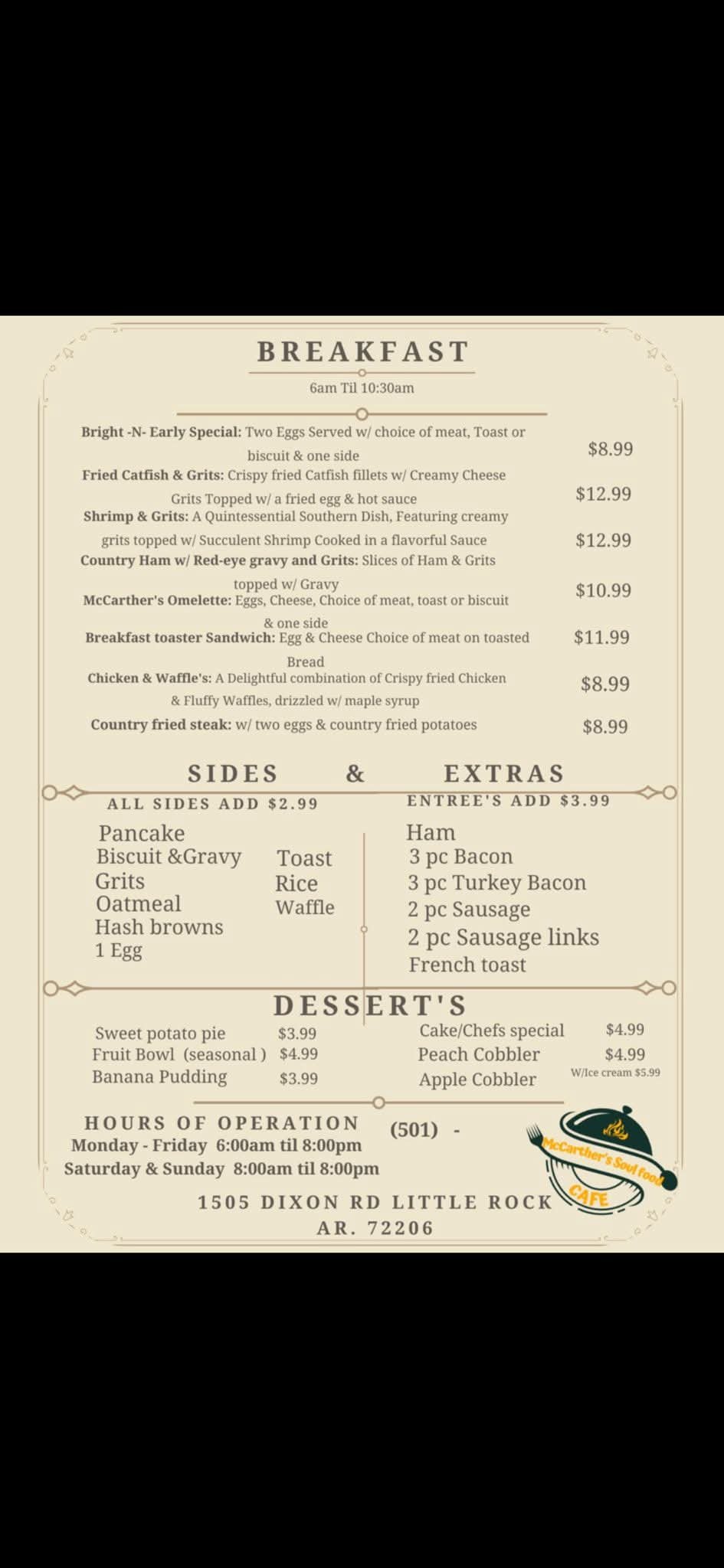 McCarther's Soul Food Cafe serves up authentic Southern comfort food in Little Rock, from hearty breakfasts to satisfying lunches and family dinners. Specializing in flavorful chicken dishes and soul food classics, we also offer catering services for your special events. Choose us for our commitment to quality ingredients, traditional recipes, and a warm, welcoming atmosphere that feels like home. What sets us apart is our dedication to consistent, delicious food and friendly service that keeps our customers coming back for more. Visit us today and experience the taste of true Southern hospitality!